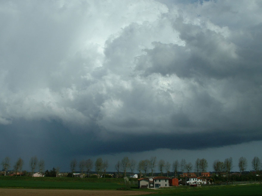 Una foto panoramica del sistema temporalesco (ore 16,00) che ora sta evolvendo in una normale multicella, probabilmente perchè è venuta meno una convergenza al suolo tra il vento da est ed un flusso sud-occidentale (vedi mappa BOLAM dei venti a 2 m). Si notino i downdrafts sulla parte sinistra della foto che scendono dalla parte medio-alta del Cb.